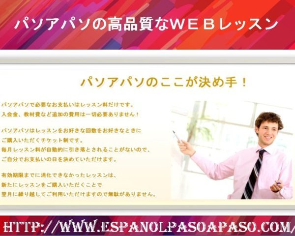 パソアパソでは、日時と講師が選べる自由予約制で、お気に入りのレッスンを組み立てることができます。さらに7つの細かなレベル設定と豊富なコースで、あなたにピッタリのレッスンがきっと見つかります。スペイン語の習得は継続が大切です。パソアパソのキャンペーンを利用して、毎月スペイン語レッスンを続けましょう。 http://www.espanolpasoapaso.com/ Slideshow ...