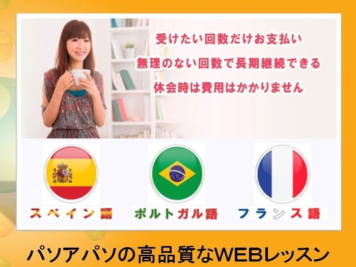 1レッスンの長さは50分、週1回でもしっかり学習量を確保することができます。マンツーマンレッスンなので誰に邪魔されることなくご自分のペースで学ぶことができます。初めてパソアパソのレッスンを受けられる方には無料体験レッスン、入会キャンペーンも実施しています。まずはお問い合わせください。 スペイン語レッスンの詳細については、下記をご覧ください。スペイン語オンラインレッスン Tagged スペイン語オンラインスクール, スペイン語オンラインレッスン, スペイン語skypeレッスン, スペイン語Webレッスン, パソアパソ, classroom, dictionary, english, french, german, grammar, internet, italian, language, one to one lesson, one-on-one lesson, online lesson, Paso a Paso, pasoapaso, portuguese, Spanish, spanish online lesson, spanish online school, spanish skype lesson, spanish web lesson, travel conversation, web lesson 2006年開校のスペイン語オンラインレッスン パソアパソ。スカイプを使ってネイティブ講師による高品質なスペイン語レッスンをご提供しています。お仕事が忙しくてレッスンなんて続いたことがない、という方でも、インターネットを使ったオンラインレッスンなら無理なくレッスンの時間を確保できます。1レッスンはゆとりの50分で、週1回でもしっかり学べて無駄がありません。7つのレベル設定で、初心者から上級者まで、ピッタリのレベルが見つかります。DELE対策、ビジネス、旅行など豊富なコースをご用意。無料体験レッスン実施中。 パソアパソ とはスペイン語で一歩ずつという意味です。1つ1つ確実に学んでいき、忘れない、無駄にならないスペイン語の習得を目指しています。ネイティブスピーカーによるマンツーマンレッスンで発音や自然な会話を習得し、オリジナルの教材で文法やボキャブラリーもしっかり学んでいただけます。講師が選べる自由予約制で忙しくてスクールに通えない方や時間の不規則な方でも無理なくレッスンが続けられます。レッスンを受ける分だけご購入いただくチケット制で、レッスンの消化に追われることもありません。まずは無料体験レッスンで、自分のペースで一歩ずつ、しっかり学べるパソアパソのオンラインレッスンを是非お試しください。